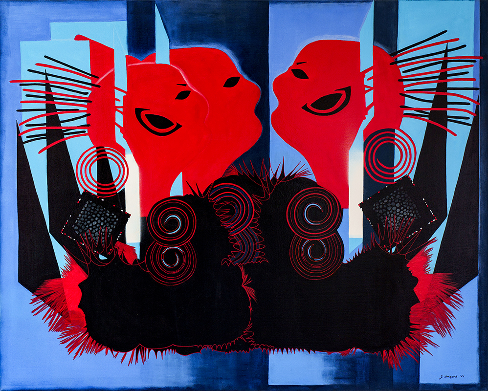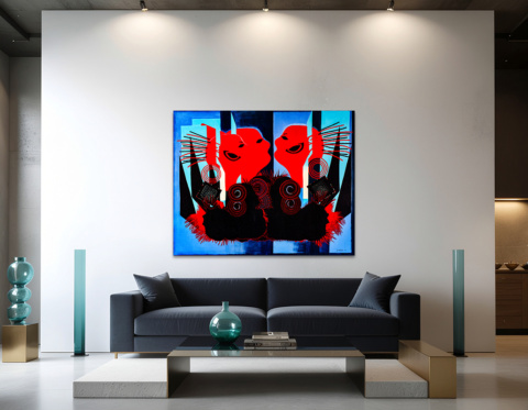 The picture carries an enormous emotional intensity. The direct confrontation of the two red heads conveys a tense, almost explosive or passionate interaction – an interplay of attraction and repulsion. The clear symmetry and stark contrast of the red and black forms against the cool blue heighten the sense of duality and confrontation. The painting could reflect the complex nature of human relationships – the interplay of love and hate or the interdependence of two powerful, almost demonic or animalistic personalities.