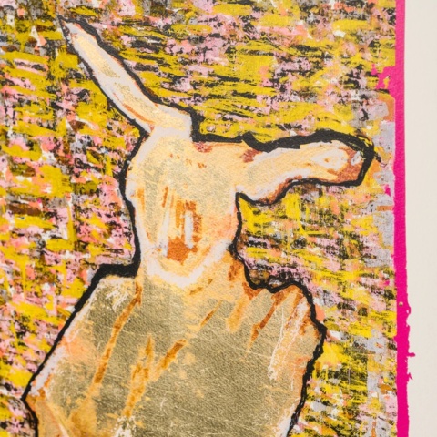 – With hand-applied gold leaf, screen-printed varnish and accent colors, this is a mixed-media artwork in a hand-signed, limited edition